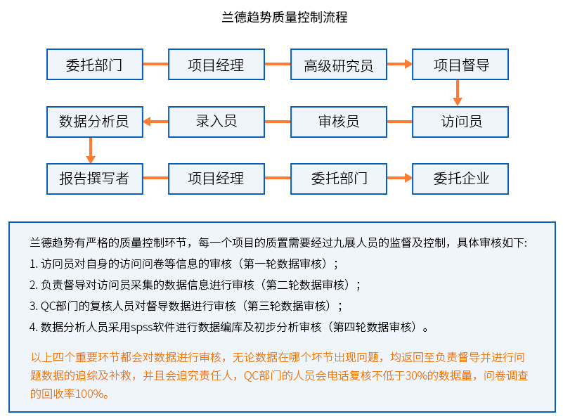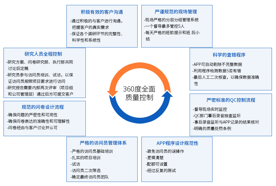 蘭德趨勢(shì)秉承客觀、專業(yè)、高效的服務(wù)理念,在各個(gè)環(huán)節(jié)均有嚴(yán)格的質(zhì)量控制體系,堅(jiān)持360度全面質(zhì)量管理,并于2008年自主編寫訪問員手冊(cè)及督導(dǎo)執(zhí)行手冊(cè),截止目前進(jìn)行了三次修訂,更加規(guī)范了項(xiàng)目執(zhí)行流程,確保了數(shù)據(jù)的真實(shí)有效,360度全面質(zhì)量控制圖如下: